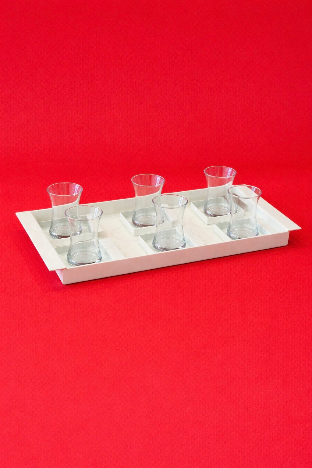 • يتكوّن الطقم من 6 أكواب زجاجية مع صحونها المعدنية.