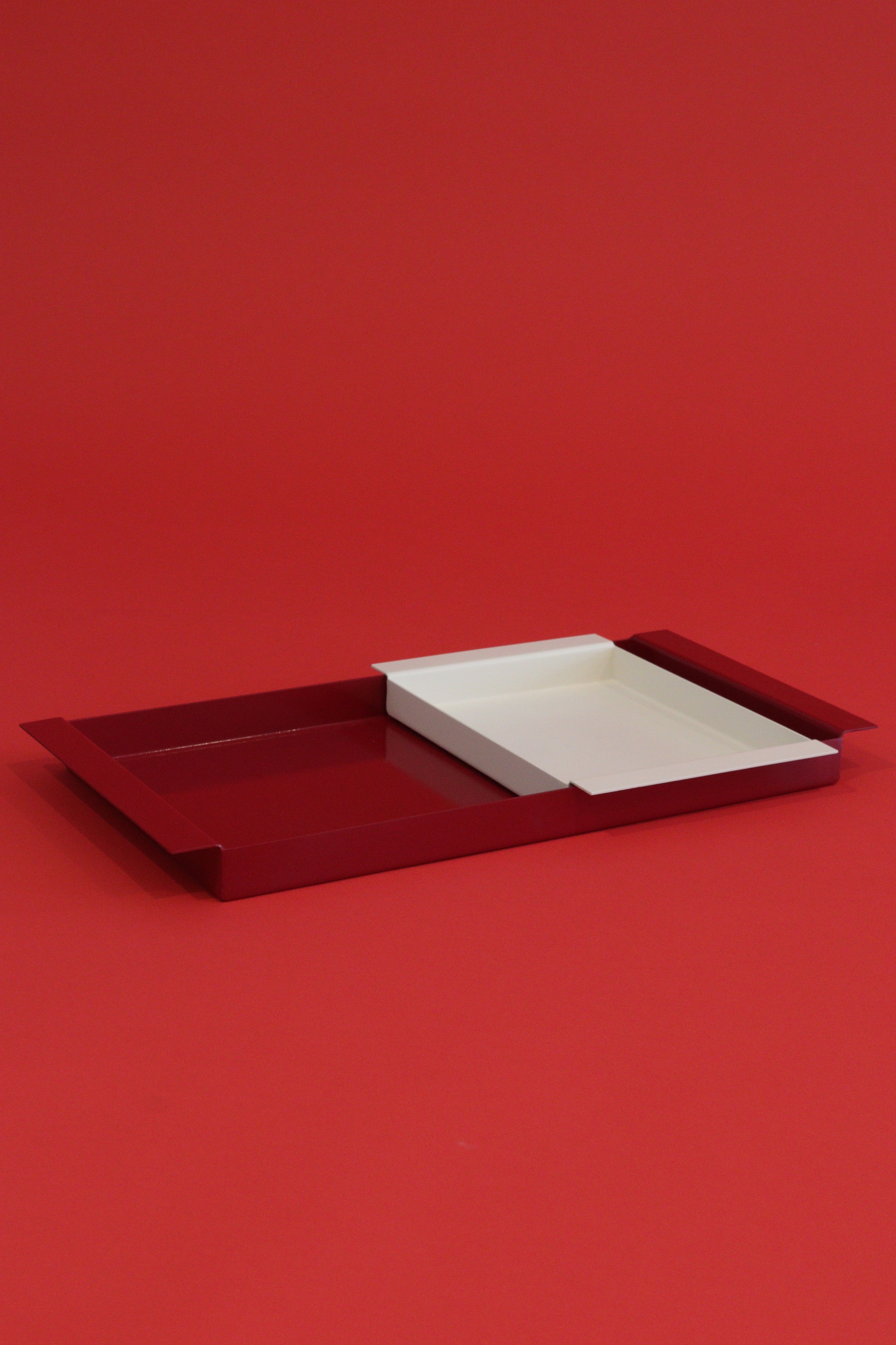 Metal trays designed for flexible use, whether individually ( each able to function on its own ) or stacked together.